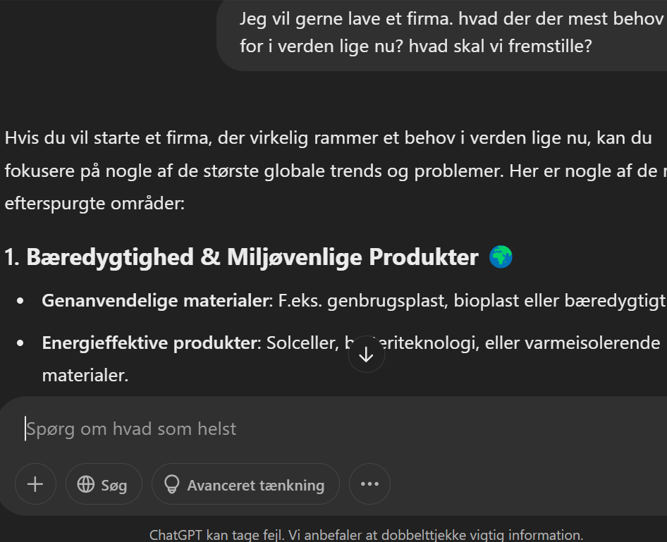 Vi har brugt Chatgpt til at lave en brainstorm. vi spurte chatgpt hvad det ville være smartest at lave et firma om. Hvad er der mest behov for i verden lige nu? Chatgpt foreslog blandt andet at vi skulle lave et firma indenfor teknologi. Vi landte på at lave 3d modeller evt. af skolen. efter lidt research fandt vi ud af at nogle firmaer tilbyder 360 rundvisninger.
